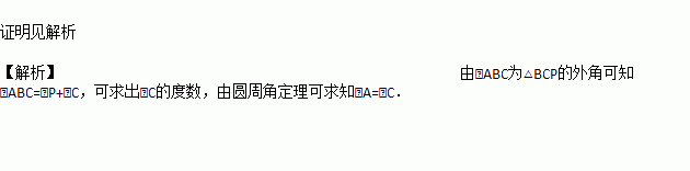 如图,AB、CD是⊙O的两条弦,延长AB、CD交于点P,连接AD、BC交于点E.∠P=30°,∠ABC=50°,求∠A的度数.