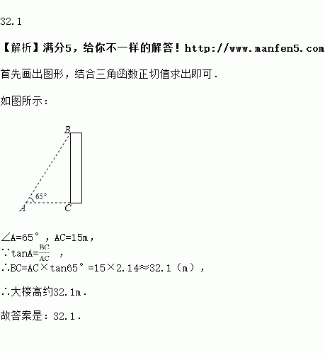 若在离大楼的地面上看大楼顶部,仰角为,则大楼高约________.