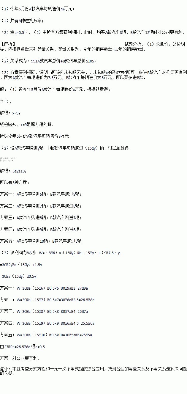(1)今年5月份A款汽车每辆售价多少万元?