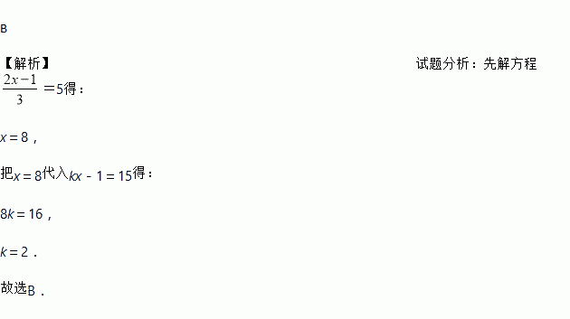 B 【解析】试题分析:先解方程=5得: x=8, 把x=8代入kx-1=15得: 8k=16, k=2. 故选B.