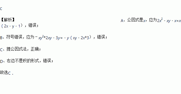 A. 2x2﹣xy﹣x=2x(x﹣y﹣1) B. ﹣xy2+2xy﹣3y=﹣y(xy﹣2x﹣3)