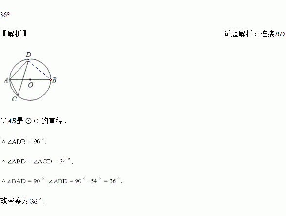 如图,AB为⊙O的直径,CD为⊙O的弦,∠ACD=54°,则∠BAD= .