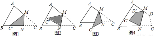 (4)将上述问题推广,如图4,将四边形ABCD纸片沿MN折叠,使点C、D落在四边形ABNM的内部时,∠AMD′+∠BNC′与∠C、∠D之间的数量关系是 .