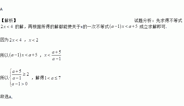 若不等式2x<4的解都能使关于x的一次不等式(a﹣1)x<a+5成立,则a的取值范围是( )