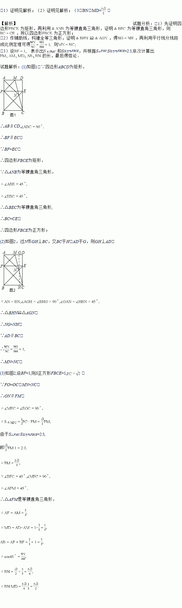 已知:矩形ABCD内一点N,△ANB为等腰直角三角形,连结BN、CN并延长分别交DC,AD于点E,M,在AB上截取BF=EC,连接MF.