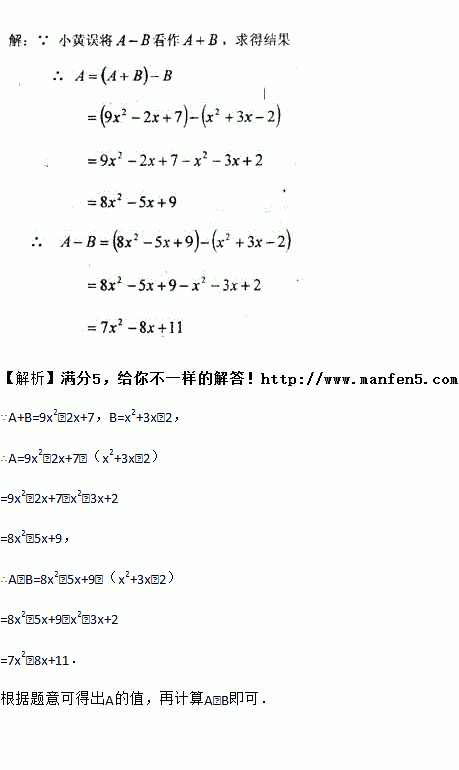 小黄做一道题“已知两个多项式A,B,计算”.小黄误将看作,求得结果是.若,请你帮助小黄求出的正确答案.