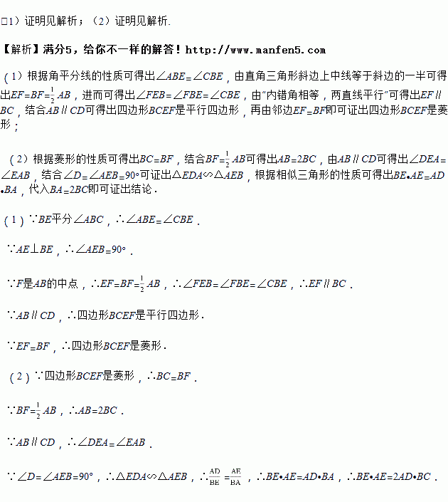 求证:(1)四边形BCEF是菱形;(2)BE•AE=2AD•BC.
