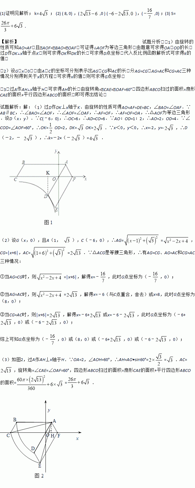 如图,将平行四边形ABCO绕点A逆时针旋转得到平行四边形ADEF,AD经过点O,且AO:OD=1:2,点F恰好落在x轴的正半轴上,若点C(﹣6,0),点D在反比例函数y=