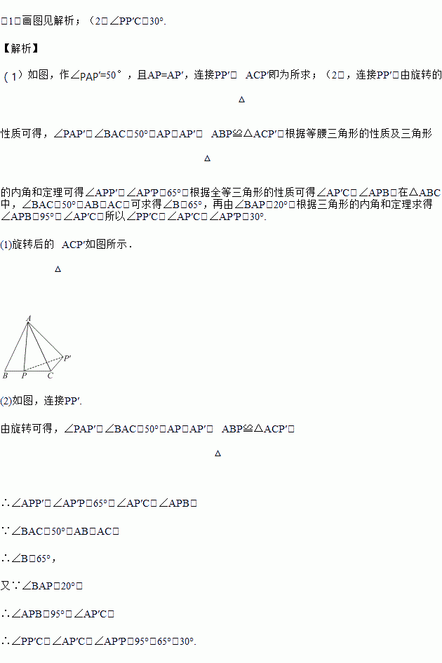 如图,△ABC中,AB=AC,∠BAC=50°,P是BC边上一点,将△ABP绕点A逆时针旋转50°,点P旋转后的对应点为点P′.
