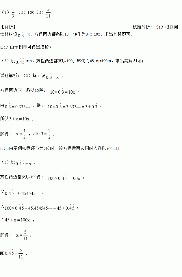 (2)方法归纳:由示例可知:如果循环节为1位时,设方程后两边同时乘以10.那么如果循环节为2位时,设方程后两边同时应乘以 ;