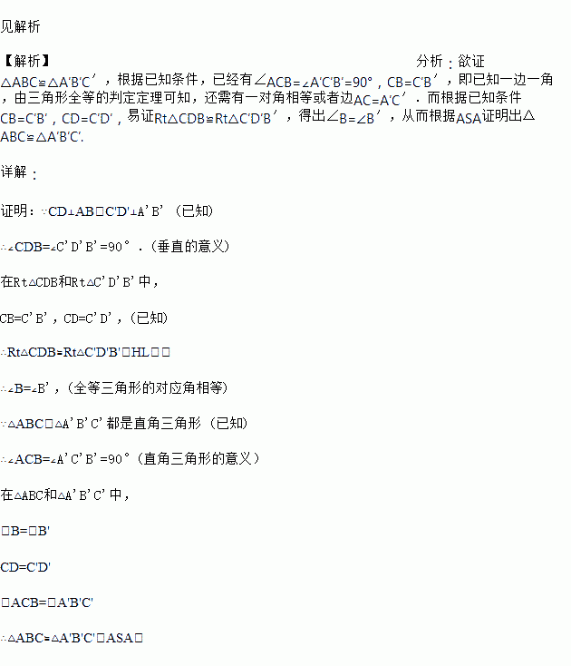 已知:如图,CD、C′D′分别是Rt△ABC,Rt△A′B′C′斜边上的高,且CB=C′B′,CD=C′D′.求证:△ABC≌△A′B′C′.