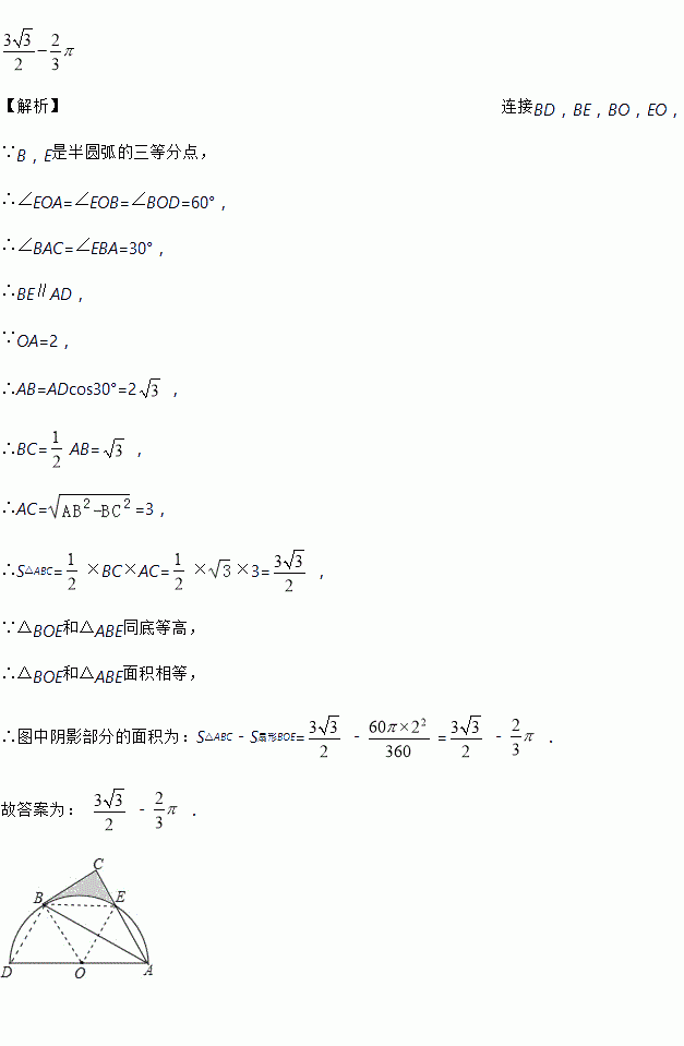 如图,以AD为直径的半圆O经过Rt△ABC的斜边AB的两个端点,交直角边AC于点E.B、E是半圆弧的三等分点,若OA=2,则图中阴影部分的面积为_____.