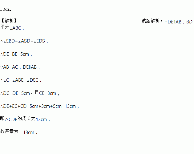 如图,在△ABC中,AB=AC,D、E两点分别在AC、BC上,BD是∠ABC的平分线,DE∥AB,若BE=5cm,CE=3cm,则△CDE的周长是_____.