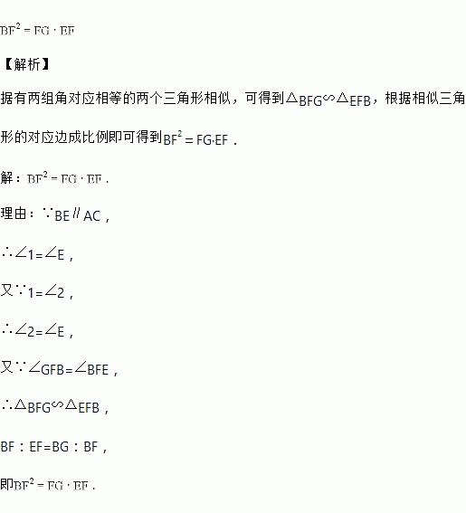 已知:如图,D是AC上一点,BE∥AC,BE=AD,AE分别交BD、BC于点F、G,∠1=∠2,则线段之间的关系为____________________.