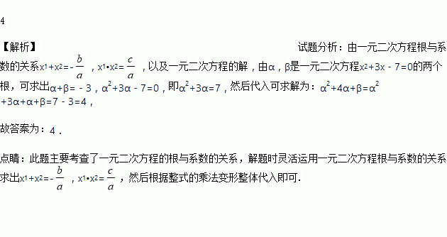 设α、β是一元二次方程x2+3x-7=0的两个根,则α2+4α+β=_______.