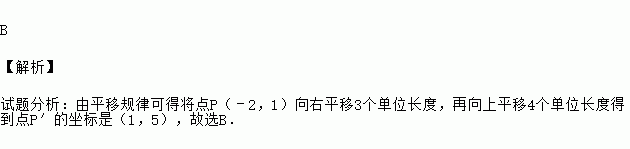 B 【解析】 试题分析:由平移规律可得将点P(﹣2,1)向右平移3个单位长度,再向上平移4个单位长度得到点P′的坐标是(1,5),故选B.