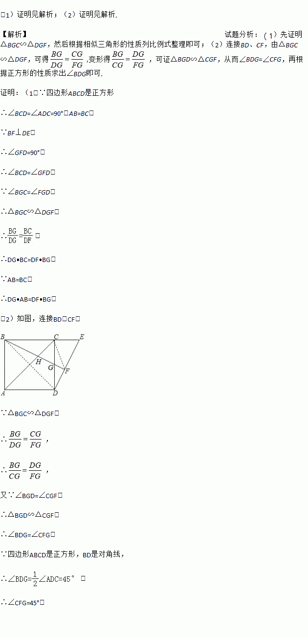 如图,点E是正方形ABCD的边BC延长线上一点,联结DE,过顶点B作BF⊥DE,垂足为F,BF交边DC于点G.