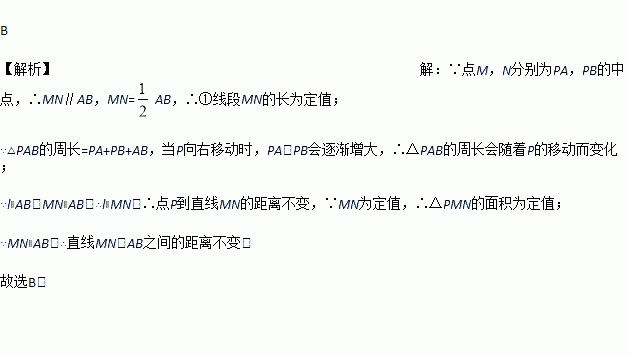 如图,点A,B为定点,定直线l∥AB,P是l上一动点,点M,N分别为PA,PB的中点,对于下列各值:①线段MN的长;②△PAB的周长;③△PMN的面积;④直线MN,AB之间的距离;其中会随点P的移动而变化的是( )