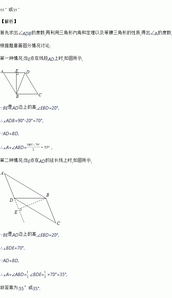 在?ABCD中,,BE是AD边上的高,,则的度数为______.
