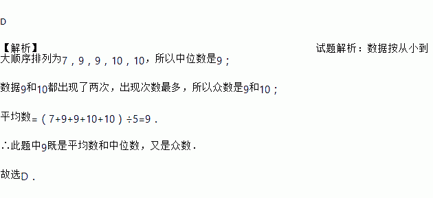 D 【解析】试题解析:数据按从小到大顺序排列为7,9,9,10,10,所以中位数是9; 数据9和10都出现了两次,出现次数最多,所以众数是9和10; 平均数=(7+9+9+10+10)÷5=9. ∴此题中9既是平均数和中位数,又是众数. 故选D.