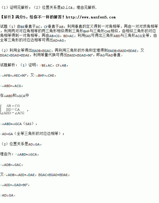 如图:在△ABC中,BE、CF分别是AC、AB两边上的高,在BE上截取BD=AC,在CF的延长线上截取CG=AB,连接AD、AG.