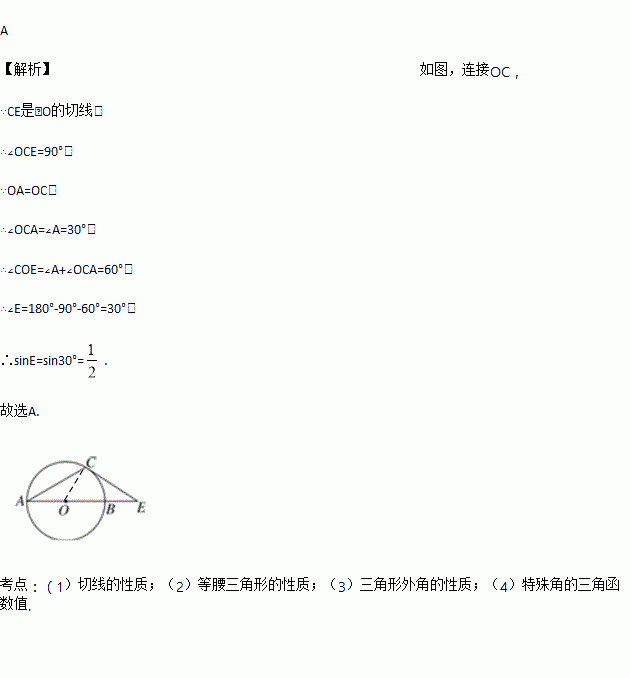 如图,AB是⊙O的直径,C是⊙O上的点,过点C作⊙O的切线交AB的延长线于点E,若∠A=30°,则sinE的值为( )