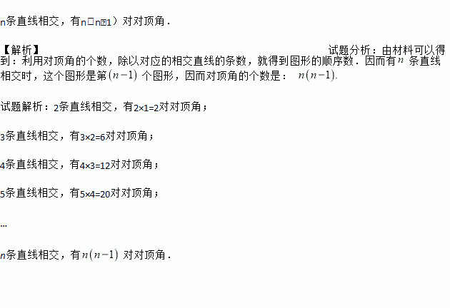 通过阅读分析上面的材料,计算后得出规律,当n条直线相交于一点时,有多少对对顶角出现(n为大于2的整数).