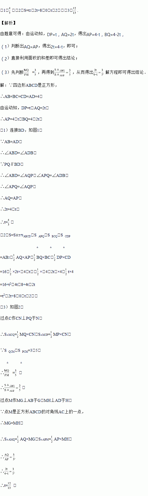 如图1,正方形ABCD中,AB=4cm,点P从点D出发沿DA向点A匀速运动,速度是1cm/s,同时,点Q从点A出发沿AB方向,向点B匀速运动,速度是2cm/s,连接PQ、CP、CQ,设运动时间为t(s)(0<t<2)