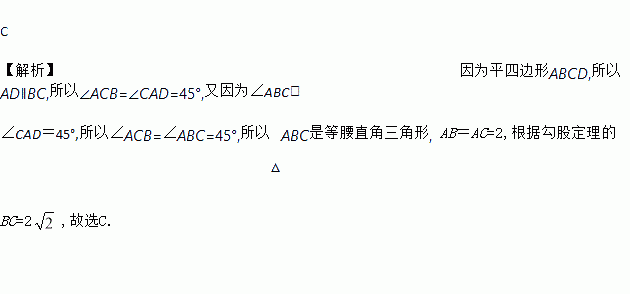 如图,在?ABCD中,连接AC,∠ABC=∠CAD=45°,AB=2,则BC的长是( )