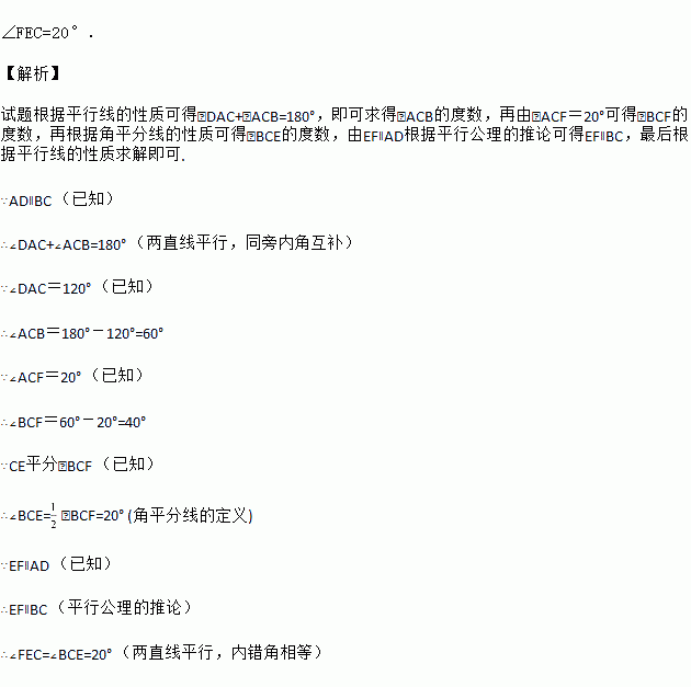 如图,EF∥AD,AD∥BC,CE平分∠BCF,∠DAC=120°,∠ACF=20°,求∠FEC的度数.