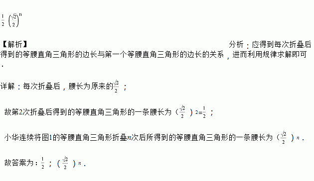 小华将一条直角边长为1的一个等腰直角三角形纸片(如图1),沿它的对称轴折叠1次后得到一个等腰直角三角形(如图2),再将图2的等腰直角三角形沿它的对称轴折叠后得到一个等腰直角三角形(如图3),则图3中的等腰直角三角形的一条腰长为_________;同上操作,若小华连续将图1的等腰直角三角形折叠n次后所得到的等腰直角三角形(如图n+1)的一腰长为_________.