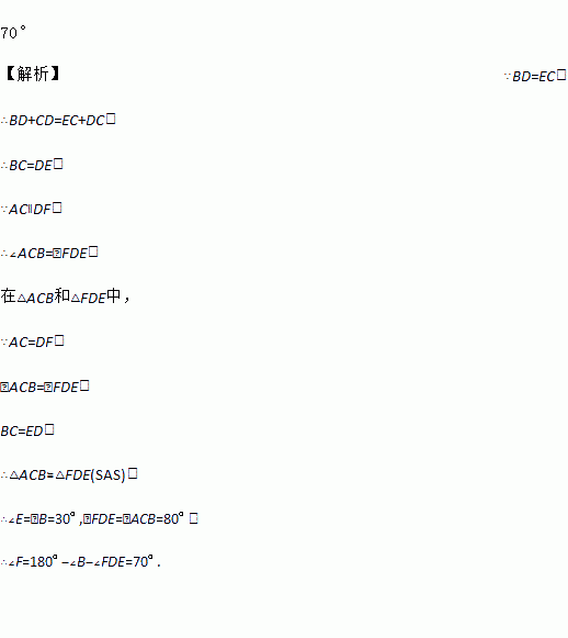 如图所示,AC=DF,BD=EC,AC∥DF,∠ACB=80°,∠B=30°,则∠F=_______.