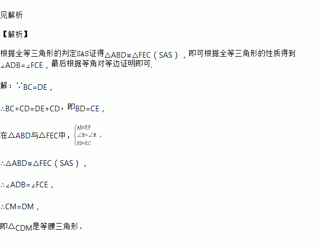如图,在△ABD和△FEC中,点B,C,D,E在同一直线上,且AB=FE,BC=DE,∠B=∠E,试说明:△CDM是等腰三角形.