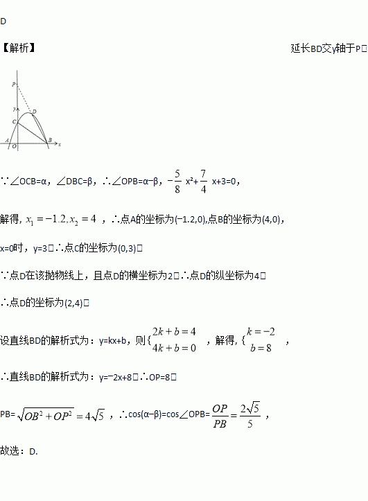 x+3的图象与x轴交于点A、B,与y轴交于点C,点D在该抛物线上,且点D的横坐标为2,连接BC、BD.设∠OCB=α,∠DBC=β,则cos(α-β)的值是( )