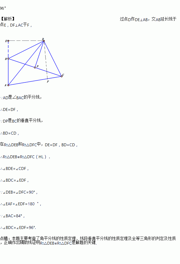 如图,△ABC中,BC的垂直平分线DP与∠BAC的角平分线相交于点D,垂足为点P,若∠BAC=84°,则∠BDC=_____.