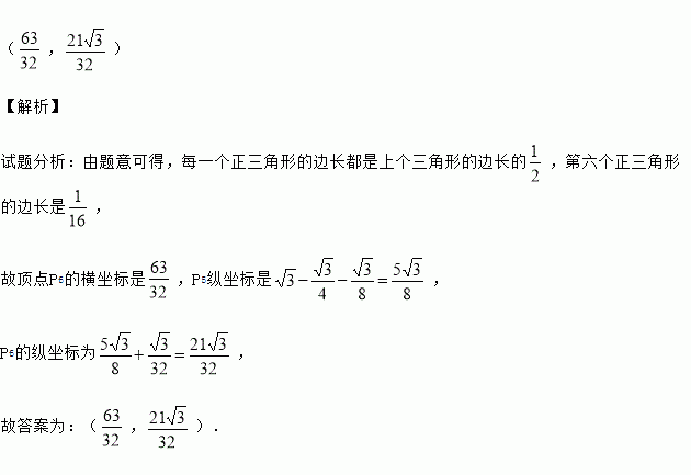如图,以O(0,0)、A(2,0)为顶点作正△OAP1,以点P1和线段P1A的中点B为顶点作正△P1BP2,再以点P2和线段P2B的中点C为顶点作△P2CP3,…,如此继续下去,则第六个正三角形中,不在第五个正三角形上的顶点P6的坐标是 .