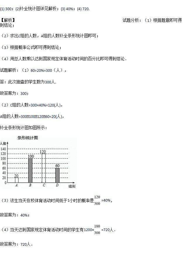 (4)若当天在校学生数为1200人,请估计在当天达到国家规定体育活动时间的学生有 人.![]()