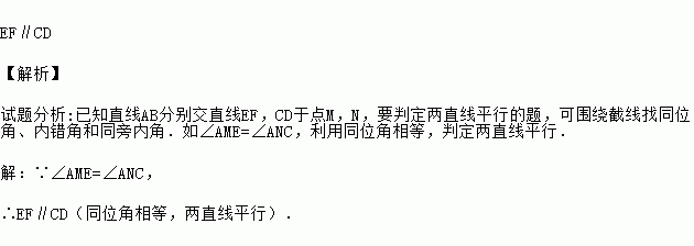 如图直线AB分别交直线EF,CD于点M,N,只需添一个条件 ,就可得到EF∥CD.