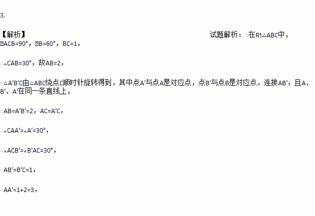 如图,在Rt△ABC中,∠ACB=90°,∠B=60°,BC=2,△A′B′C可以由△ABC绕点C顺时针旋转得到,其中点A′与点A是对应点,点B′与点B是对应点,连接AB′,且A、B′、A′在同一条直线上,则AA′的长为______