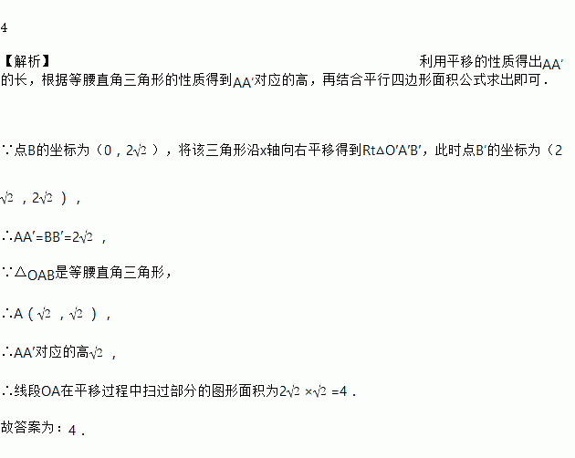 如图,O为坐标原点,△OAB是等腰直角三角形,∠OAB=90°,点B的坐标为,将该三角形沿轴向右平移得到,此时点的坐标为,则线段OA在平移过程中扫过部分的图形面积为______.