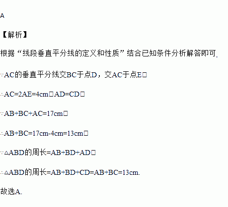 如图,在△ABC中,AC的垂直平分线交BC于点D,交AC于点E,连接AD.若△ABC的周长是17cm,AE=2cm,则△ABD的周长是( )