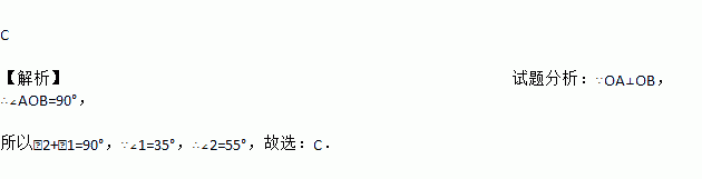 C 【解析】试题分析:∵OA⊥OB,∴∠AOB=90°, 所以∠2+∠1=90°,∵∠1=35°,∴∠2=55°,故选:C.