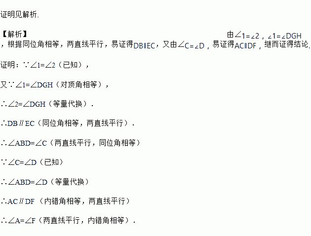 已知:如图∠1=∠2,∠C=∠D,请证明:∠A=∠F.