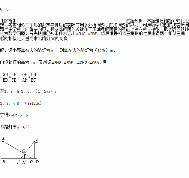 晚上,小亮走在大街上.他发现:当他站在大街两边的两盏路灯之间,并且自己被两边路灯照在地上的两个影子成一直线时,自己右边的影子长为3米,左边的影子长为1.5米.又知自己身高1.80米,两盏路灯的高相同,两盏路灯之间的距离为12米,则路灯的高为 米.