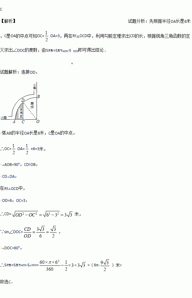 如图是某公园的一角,∠AOB=90°,弧AB的半径OA长是6米,C是OA的中点,点D在弧AB上,CD∥OB,则图中休闲区(阴影部分)的面积是( )