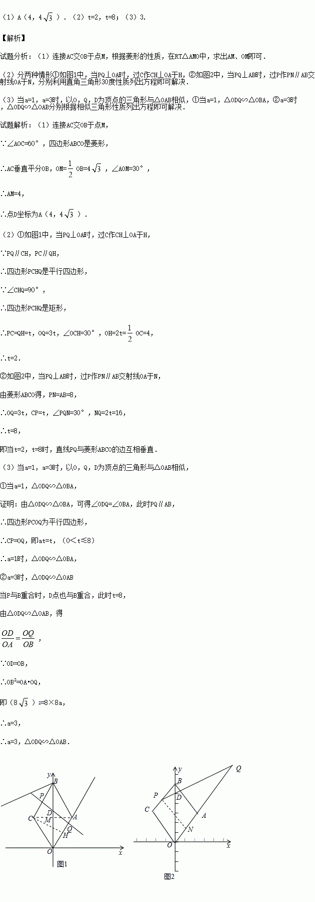 £¨3£©Èç¹û½«ÌâÖеÄÌõ¼þ±äΪµãPµÄËÙ¶ÈΪÿÃë1¸öµ¥Î»£¬µãQµÄËÙ¶ÈΪÿÃëa£¨1¡Üa¡Ü3£©µ¥Î»£¬ÉèÔ˶¯Ê±¼äΪt£¨0<t¡Ü8£©£¬ÆäËüÌõ¼þ²»±ä£®µ±aΪºÎֵʱ£¬ÒÔO£¬Q£¬DΪ¶¥µãµÄÈý½ÇÐÎÓë¡÷OABÏàËÆ£¿Çë¸ø³öÄãµÄ½áÂÛ£¬²¢¼ÓÒÔÖ¤Ã÷£®