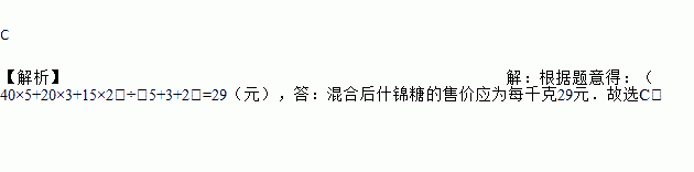 (2017•聊城)为了满足顾客的需求,某商场将5千克奶糖,3千克酥心糖和2千克水果糖混合成什锦糖出售.已知奶糖的售价为每千克40元,酥心糖为每千克20元,水果糖为每千克15元,混合后什锦糖的售价应为每千克()