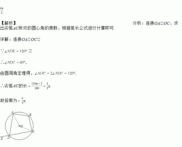 如图,四边形ABCD内接于半径为2的⊙O,E为CD延长线上一点.若∠ADE=120°,则劣弧AC的长为_____.