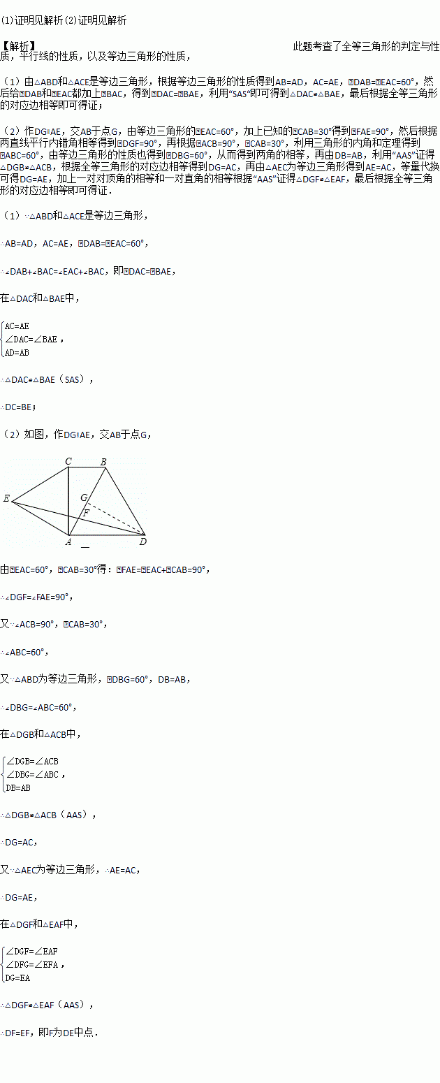 已知,Rt△ABC中,∠ACB=90°,∠CAB=30°.分别以AB、AC为边,向三角形外作等边△ABD和等边△ACE.