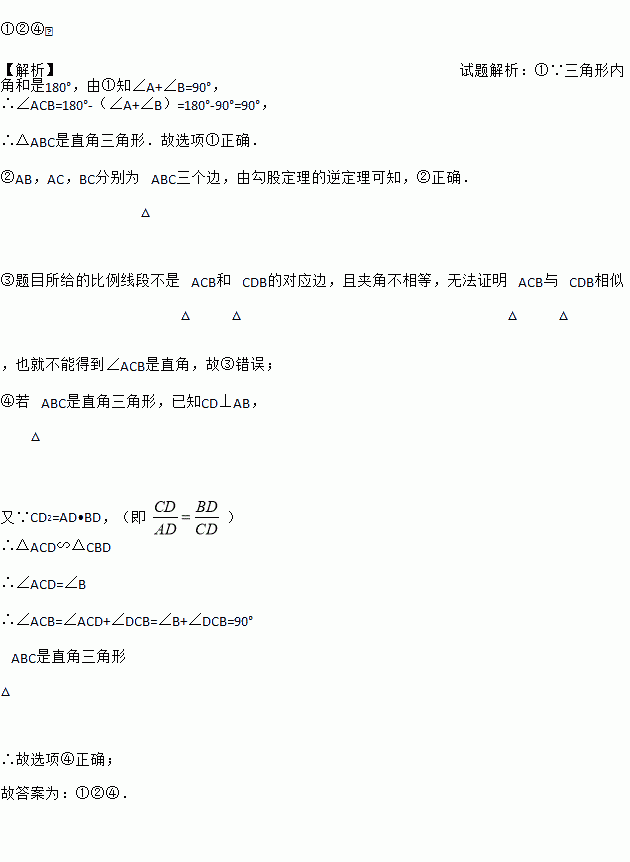 如图,△ABC中,CD⊥AB,垂足为D.下列条件中,能证明△ABC是直角三角形的有 (多选、错选不得分).